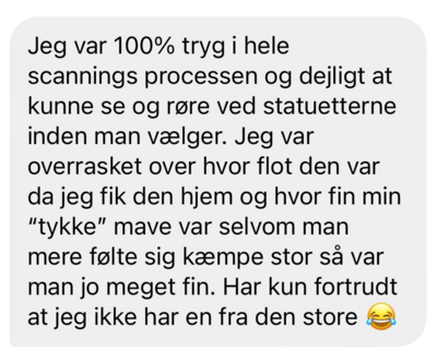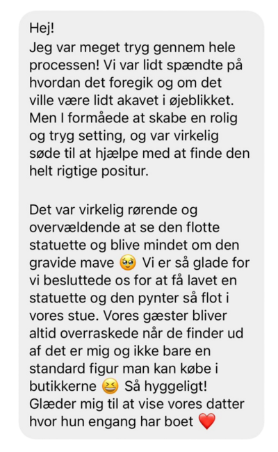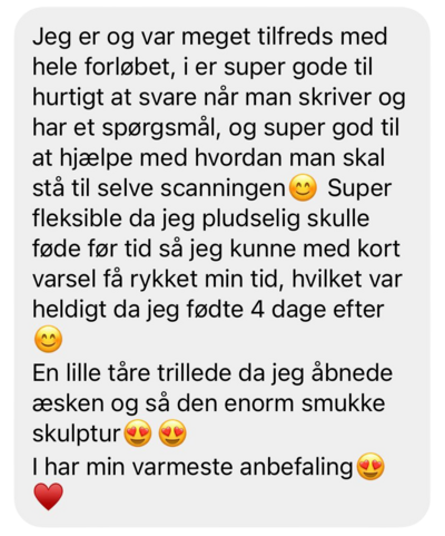 Nu er det tid! Vi forstår godt, at det er spændende at tage din nyfødte baby med. Derfor tager vi os hele formiddagen eller eftermiddagen til scanningen. Først fortæller vi dig med glæde alt om mulighederne, så du kan træffe de valg, der føles rigtige for dig. Hvilket materiale vælger du? Vil du have et skulptur med din baby ved brystet eller måske mens du ammer?